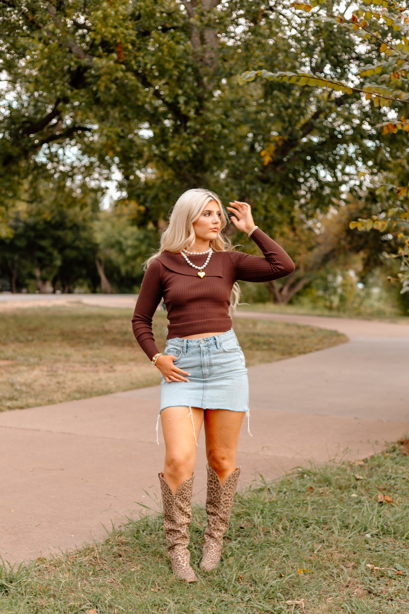 Elevate your sweater game with this form-fitting, chocolate brown knit featuring an eye-catching asymmetrical fold-over neckline. With long sleeves and a sleek silhouette, this piece blends cozy comfort with architectural edge. A versatile choice for day-to-night styling — just add jeans, trousers, or a leather skirt for an effortlessly put-together look.