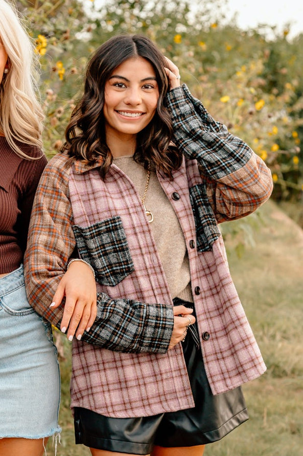Layer up in style with this colorblocked plaid flannel shacket, blending classic checks with a modern twist. Soft, warm, and perfectly oversized, it’s the ultimate go-to for cool-weather days when you want that perfect mix of shirt and jacket. Pair it with jeans or leggings for effortless fall vibes.
