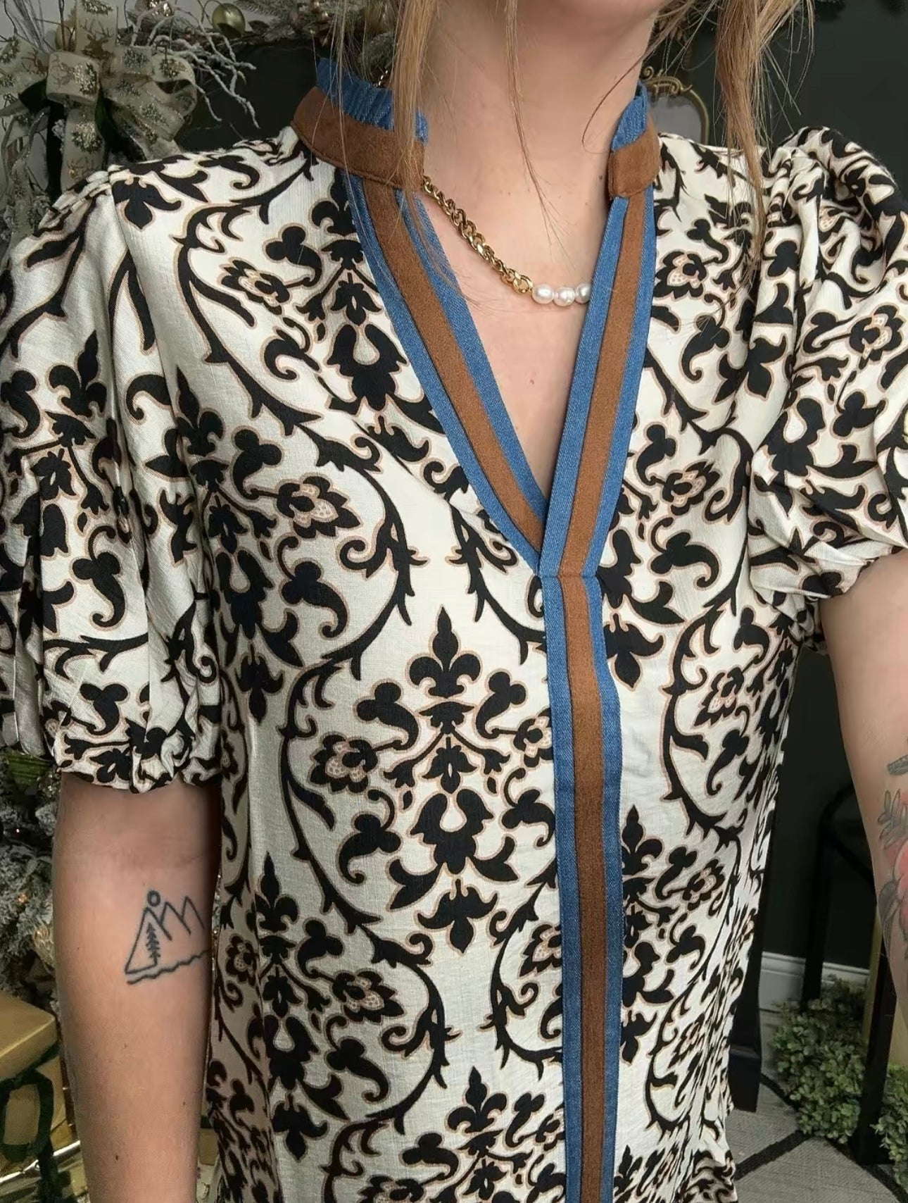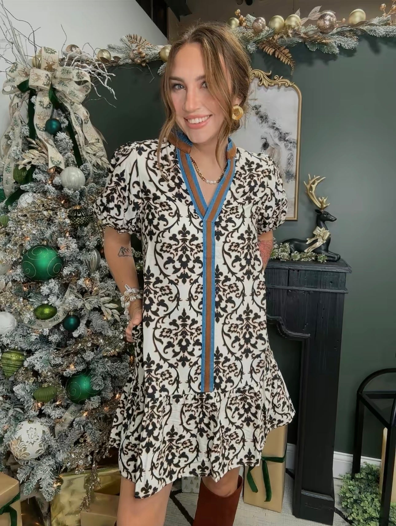 Printed lightweight dress with a denim ruffle collar and faux suede detail!