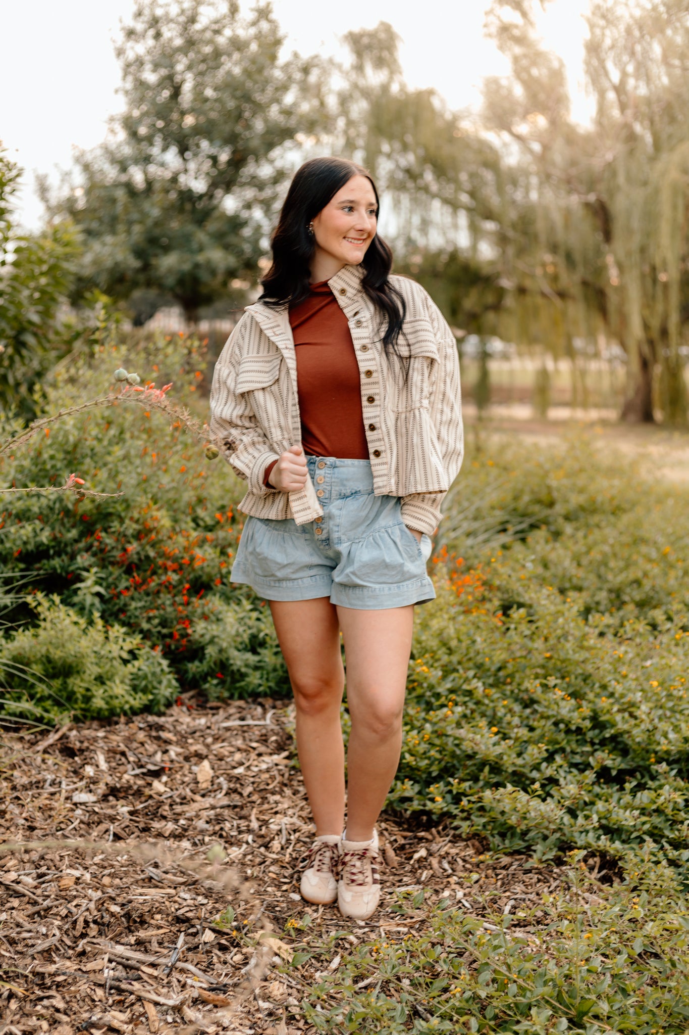 A fresh take on a classic. These pleated denim shorts feature a flattering high-rise fit with a light, mineral wash finish and a button fly for added vintage charm. Designed with soft structure and effortless style, they’re available in both light and dark denim — perfect for pairing with your favorite tees, tanks, or tucked-in blouses. Easy, elevated, and ready for everyday wear.