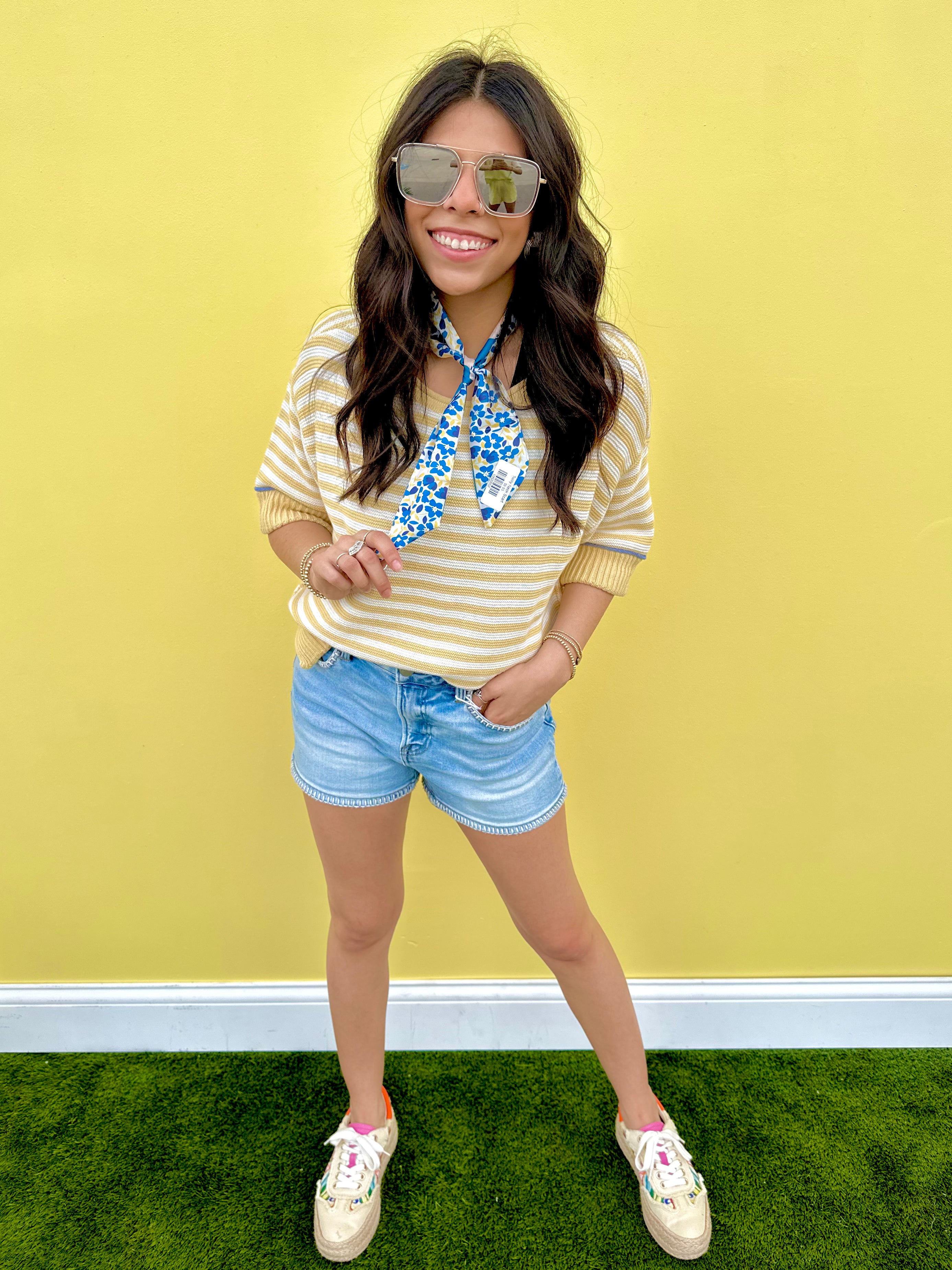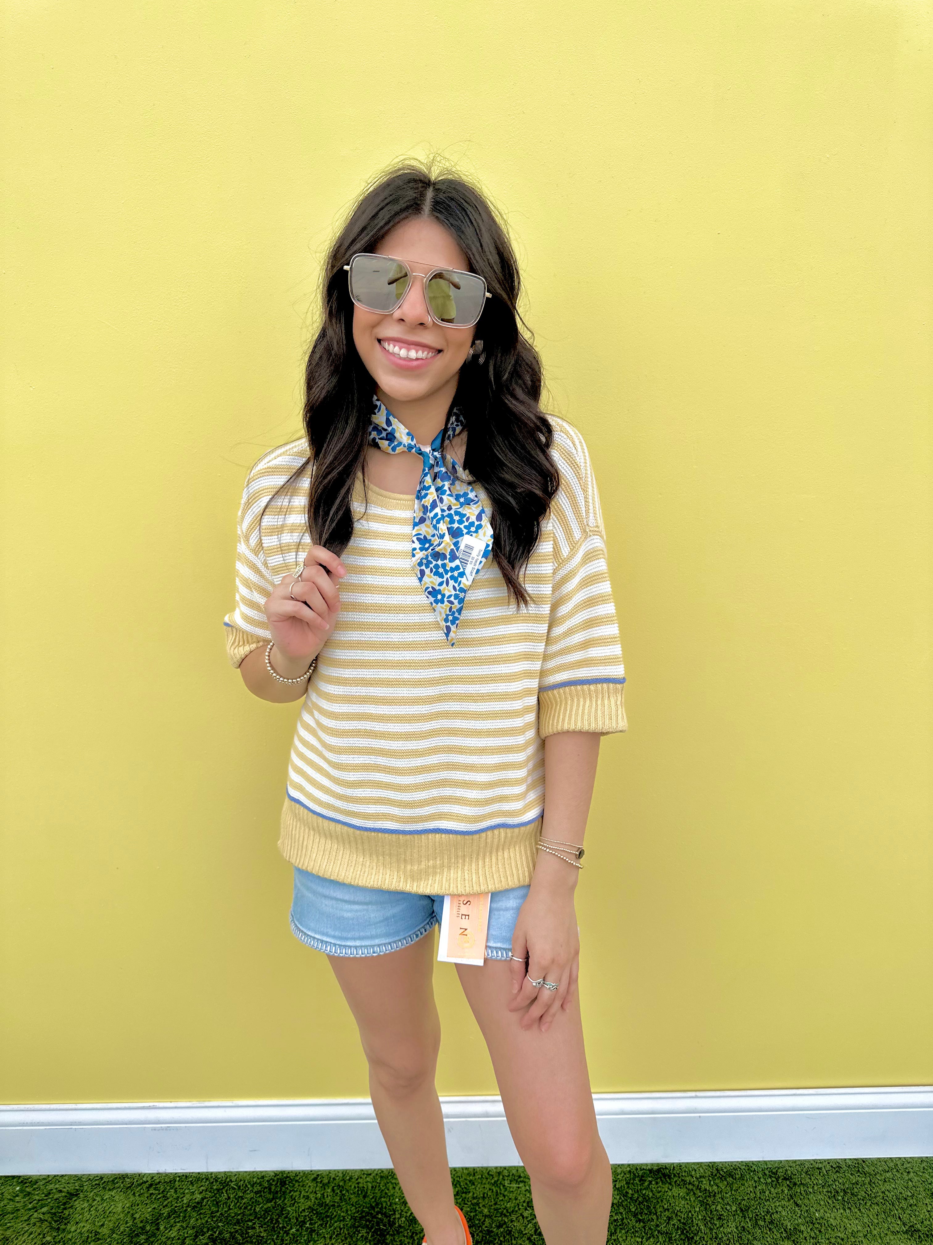 Brighten your wardrobe with this eye-catching knit top featuring bold yellow stripes paired with striking blue detailing. The raw edge contrast trim adds an edgy, modern touch to a classic silhouette. Perfect for layering or wearing solo, this sweater brings playful color and contemporary style to any casual outfit. Soft, comfortable knit fabric makes it ideal for everyday wear.