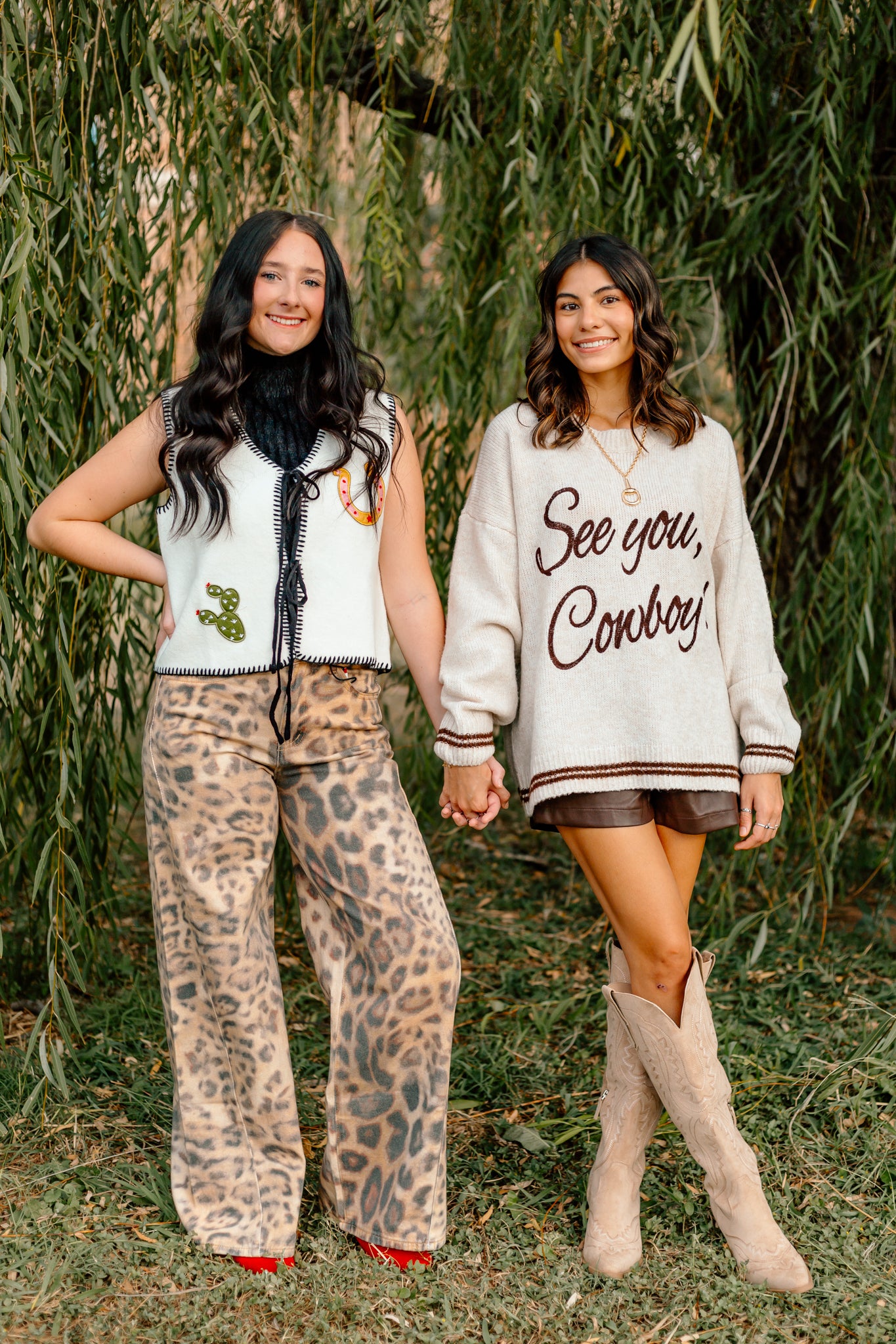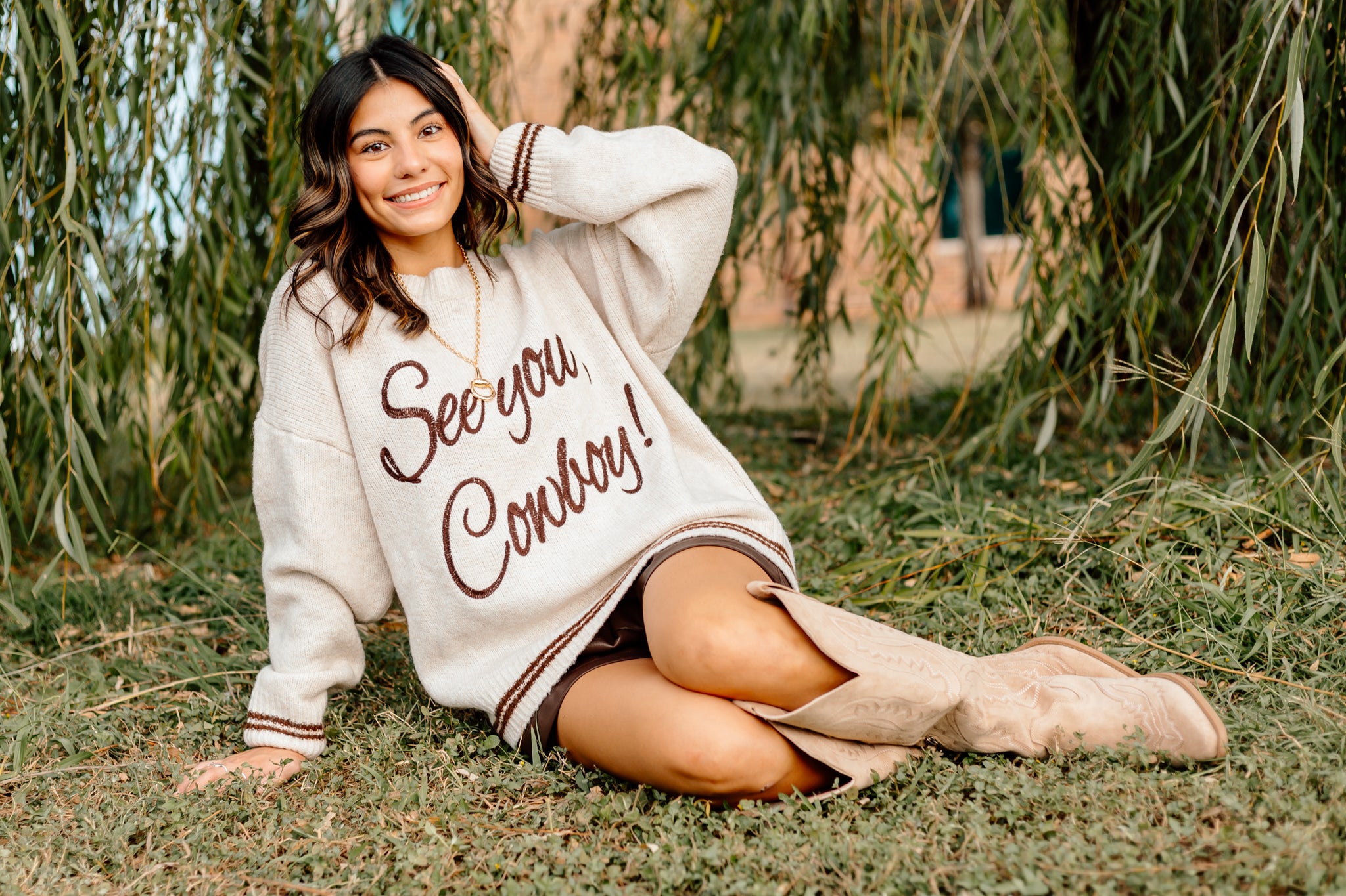 Turn heads with this cozy knit sweater featuring a huge, statement-making “See You, Cowboy” embroidery across the front. With its bold lettering and relaxed fit, it’s a fun nod to Western style with a modern twist—perfect for casual days when you want to bring a little attitude and personality to your look.